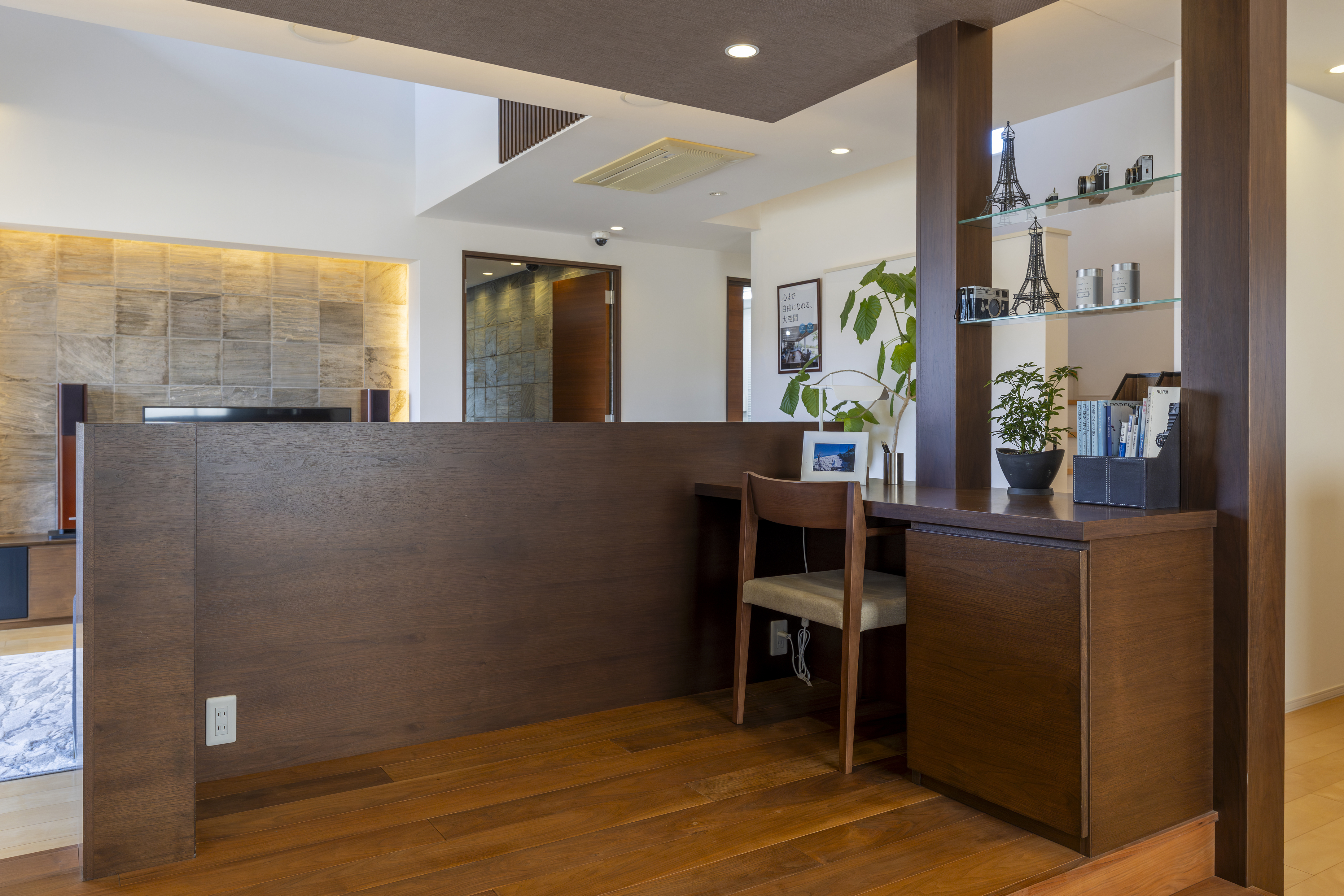 美しく、重厚感のある積層柄の外壁に、タイルを組み合わせた落ち着きのある外観。深い軒内空間から表情豊かな陰影を作り出しました。新しく、女性の為の空間「コクームスペース」や、「つながり」、「季節の移ろい」を感じて頂けるLDKスペースも必見です。ダイワハウスからの新しい提案の数々を是非、ご体感下さい。