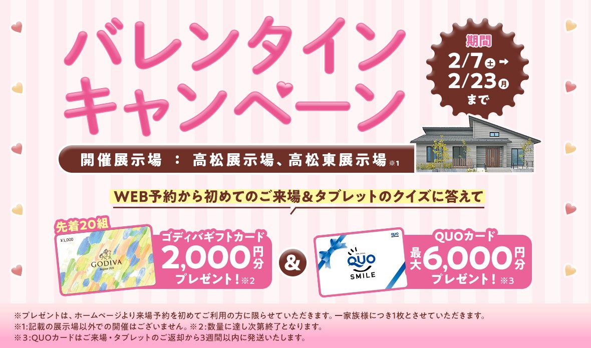 2月1日(日)~2月28日(土)の期間中、 webにてご来場予約の上、シエスタ21 一条工務店 高松展示場( i-smartⅡ )へご来場いただいたお客様に『1000円分の Quoカード 』をプレゼント!さらに、今ならもれなくQUOカード5,000円分がもらえるキャンペーンを開催中!!バレンタインキャンペーン期間中に新規WEB予約で2,000円のゴディバギフト券をプレゼント!さらにさらに、お子様お一人につき一点一条オリジナルすみっコぐらしグッズもしくは選べるトミカのミニカーなどをプレゼント!小さなお子様連れのご家族の皆様も大大歓迎!また、その他、大人の方には洗濯洗剤やキレイキレイなど素敵なプレゼントを多数ご用意しておりますので、是非この機会にご来場お待ちしております!※全館床暖房運転中どこにいても暖かい家を是非ご体験ください!